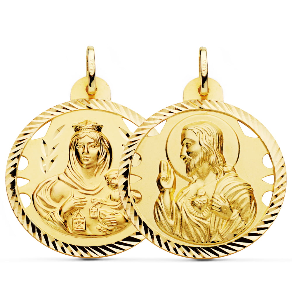 18K ESCAPULARIO HELICE CALADO VIRGEN CARMEN Y CORAZON DE JESUS 30 MM