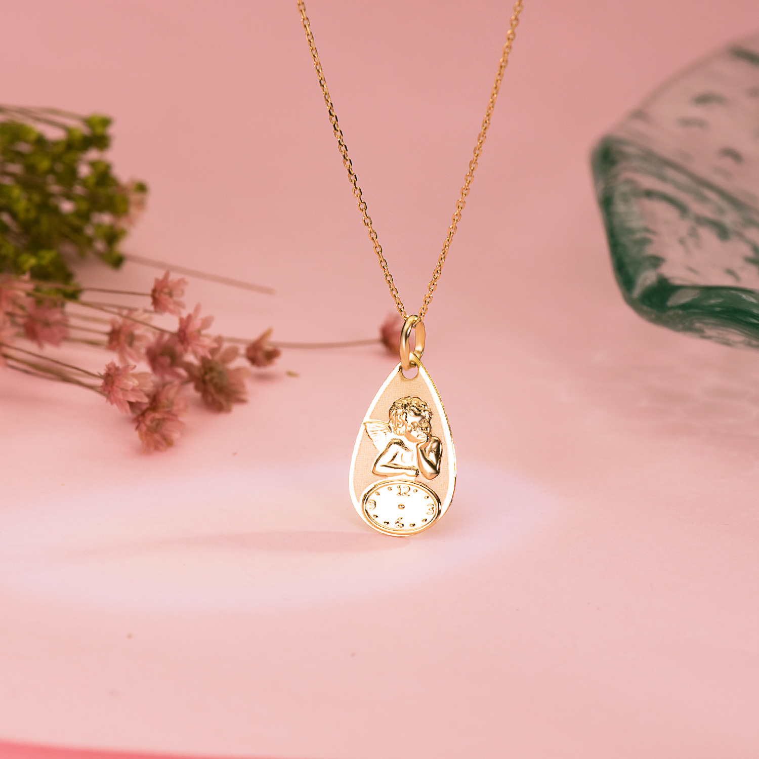 18K MEDALLA GOTA ANGELITO BURLON CON RELOJ BRILLO Y MATE. 19 X 11 MM