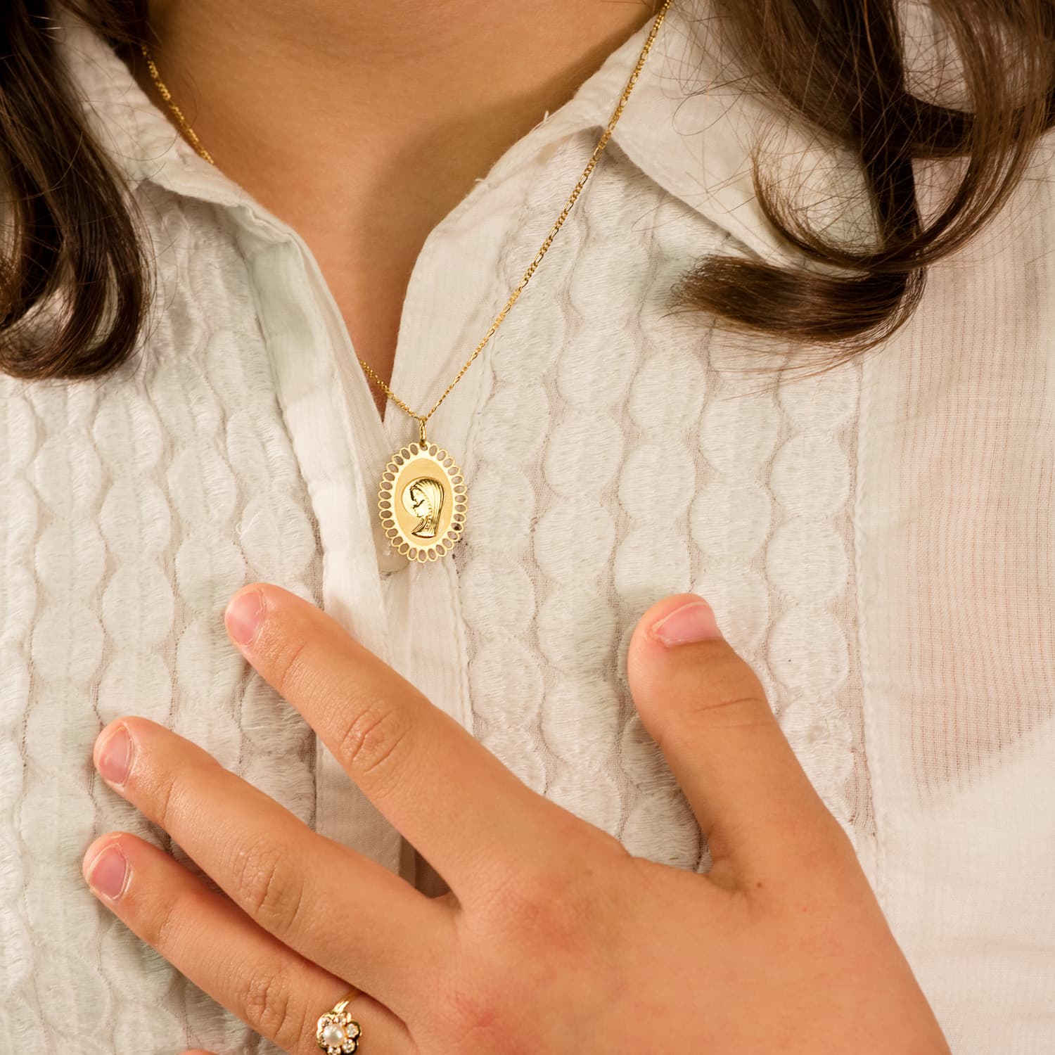 18K MEDALLA VIRGEN NIÑA CERCO OVAL CALADO 21X16 MM