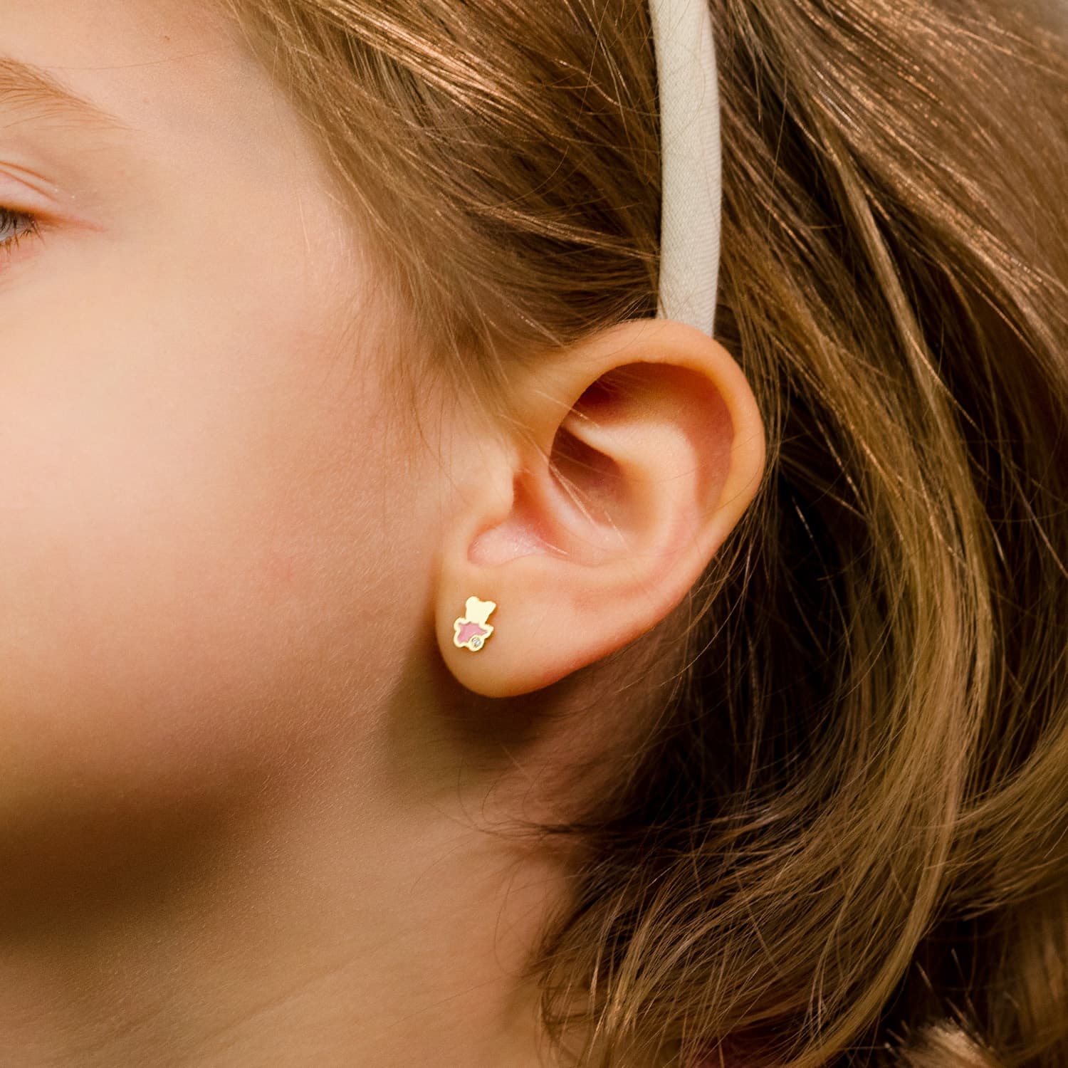 18K PENDIENTES ORO AMARILLO OSO ESMALTE ROSA 6X5 MM CIERRE TUERCA