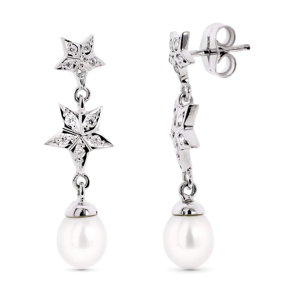 18K PENDIENTES ORO BLANCO CON ESTRELLAS Y PERLA CIERRE PRESION