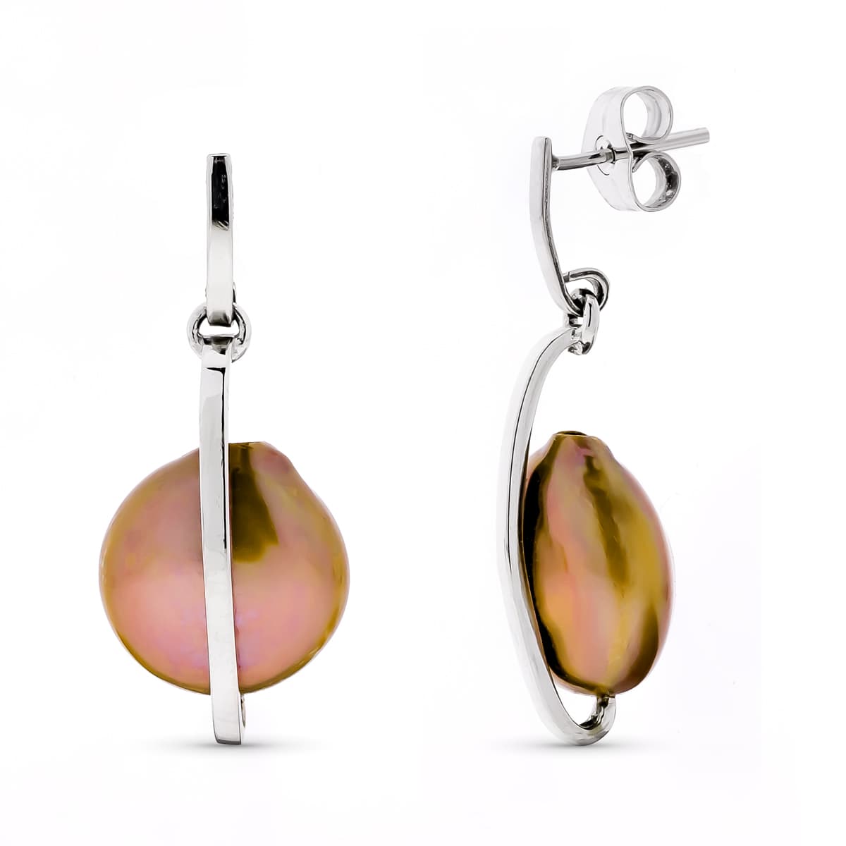 18K PENDIENTES ORO BLANCO LARGOS Y PERLA CHOCOLATE