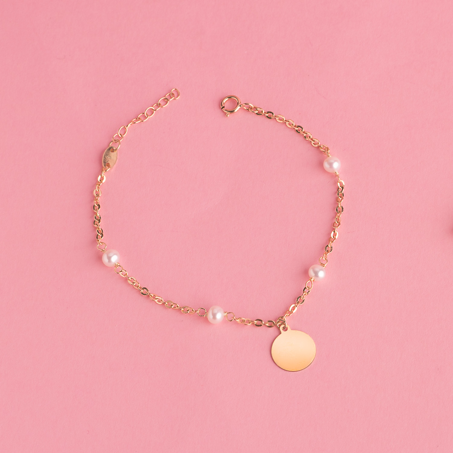 18K PULSERA ORO AMARILLO CON PERLAS 3.5MM Y PLACA CHAPA REDONDA 10MM. LARGO: 15 2CM