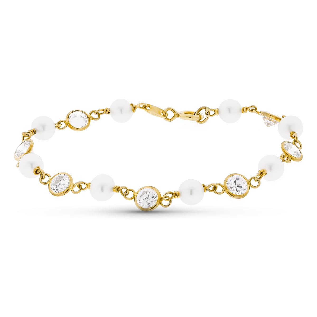 18K PULSERA ORO AMARILLO CON PERLA Y CIRCONITAS 16.5 CM