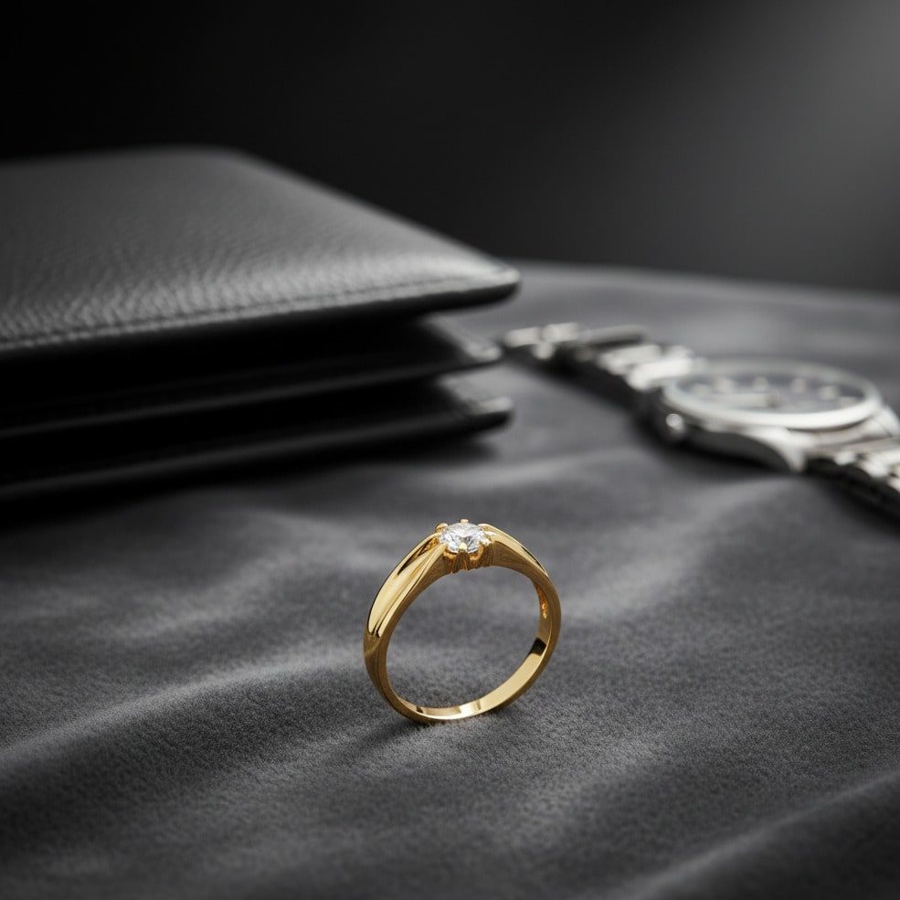 Anillo solitario de hombre forrado de oro amarillo de 18K con circonita de 5 mm y garras. Peso aproximado de 4.05 g, elegancia y la calidad al mejor precio.