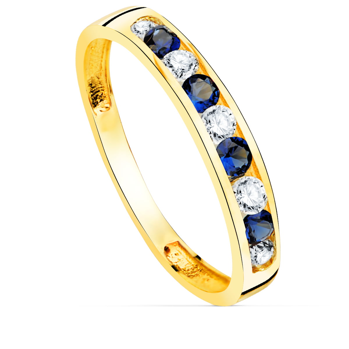 18K SORTIJA ORO AMARILLO 9 CIRCONITAS BLANCAS Y AZULES. ANCHO CUERPO: 3,5 MM