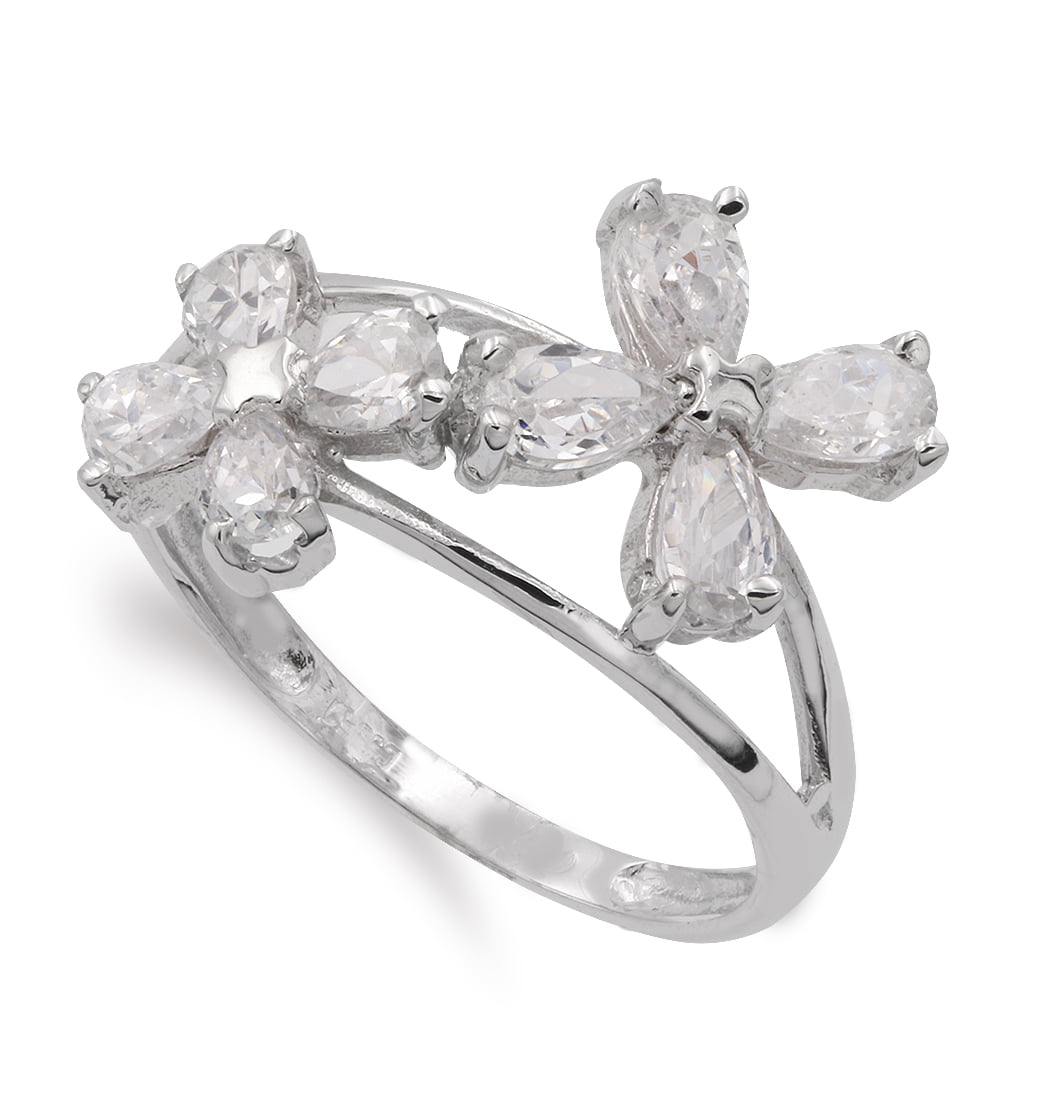 18K SORTIJA ORO BLANCO CON FLORES DE CIRCONITAS ANCHO 13 MM