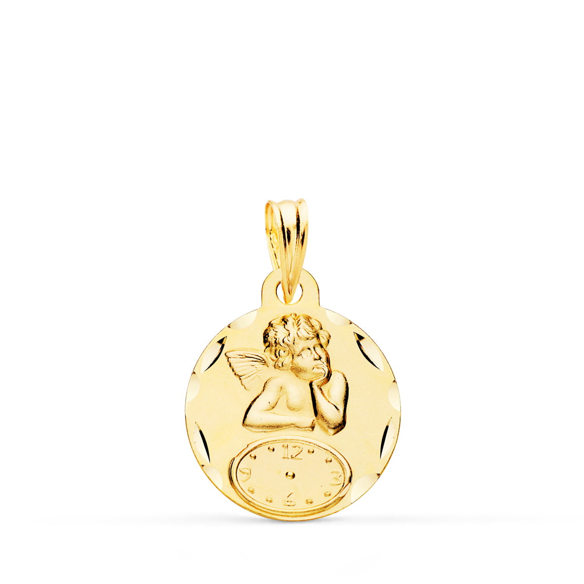 9K MEDALLA REDONDA ANGELITO BURLON CON RELOJ TALLADA 15 MM