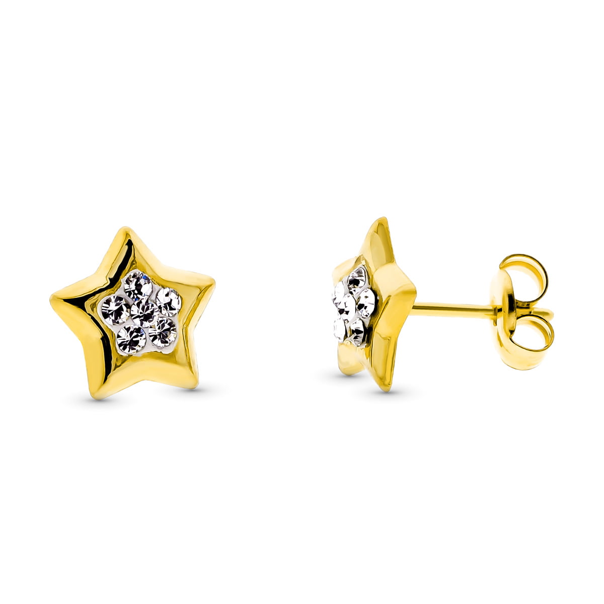 9K PENDIENTES ORO AMARILLO ESTRELLAS CON CIRCONITAS. 8 X 8 MM. CIERRE PRESION