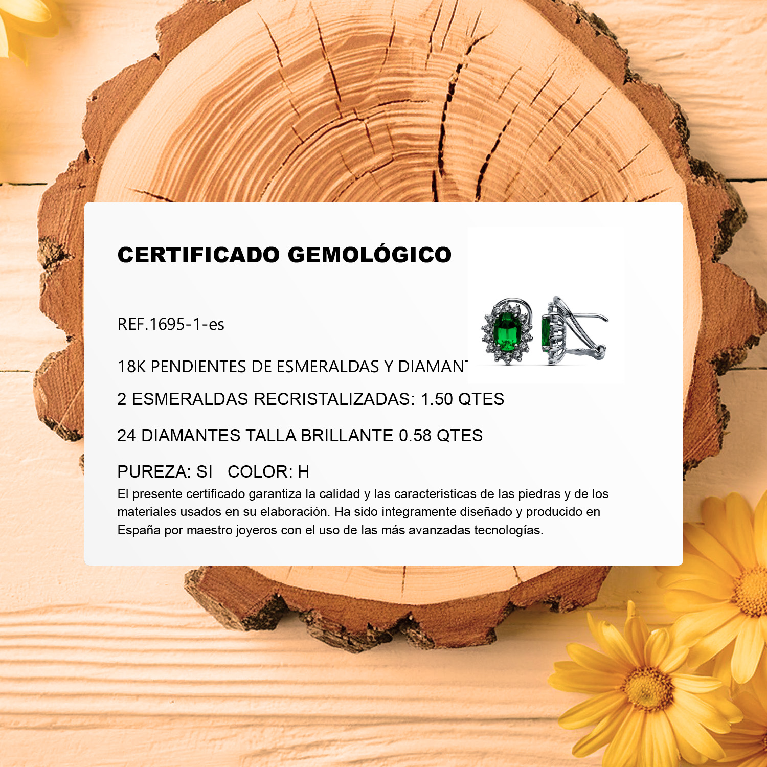 18K PENDIENTES ORO BLANCO ESMERALDA 1.50 QTS. DIAMANTES SI-H. 0.580 QTS.