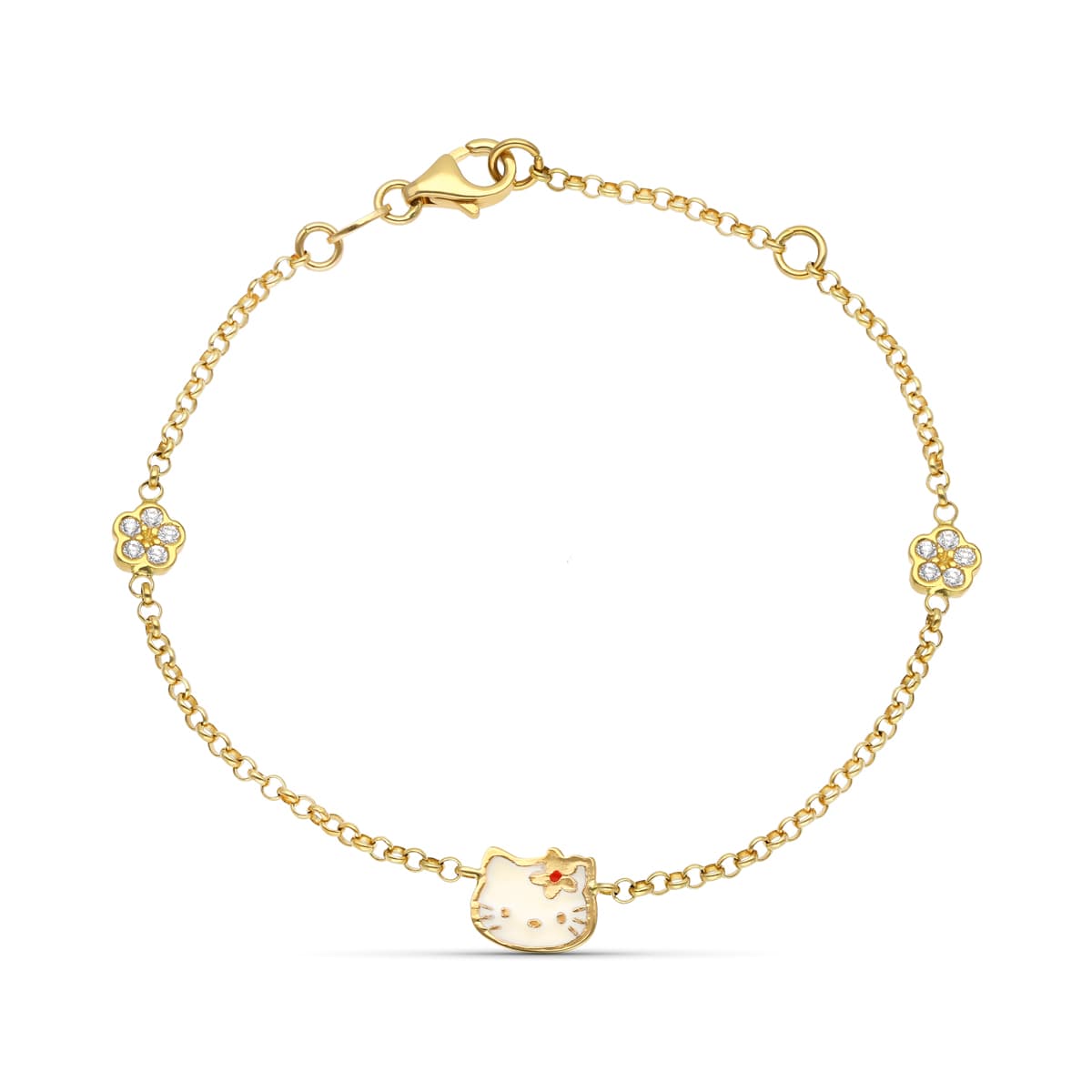 18K PULSERA ORO AMARILLO ESMALTE GATO Y FLOR CIRCONITAS 18 CM
