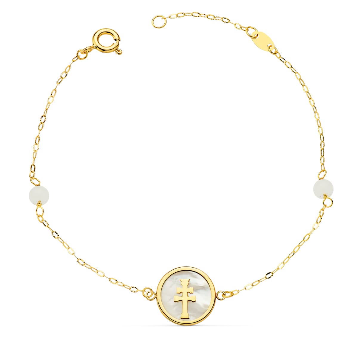 PULSERA NACAR CON CRUZ CARAVACA 12 MM Y BOLAS JADE 4 MM CADENA 18 2.5 CM