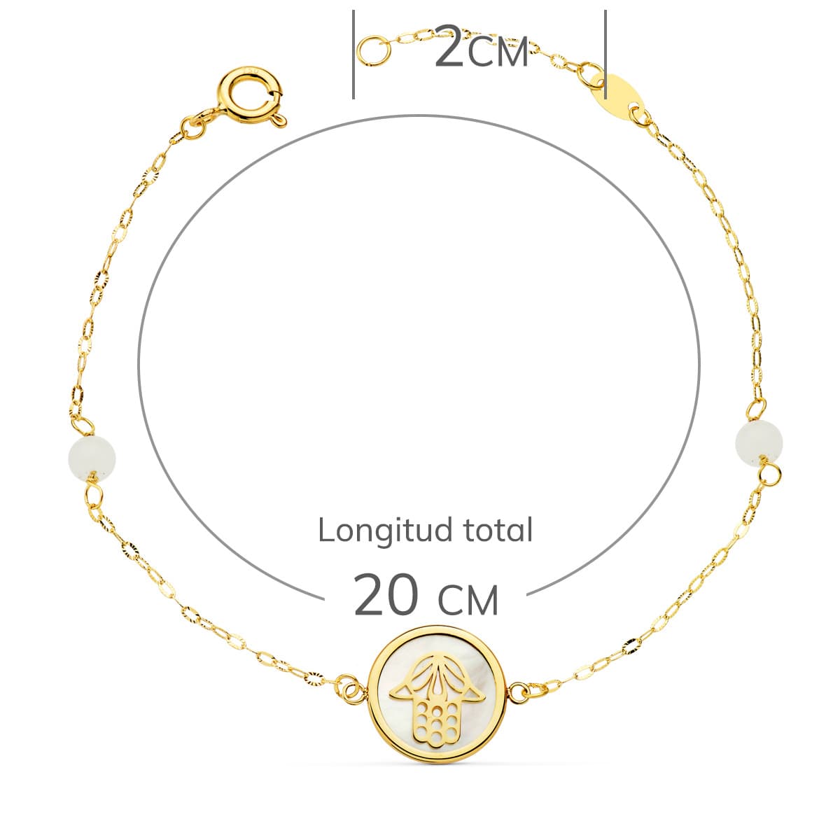 PULSERA NACAR CON MANO DE FATIMA 12 MM Y BOLAS JADE 4 MM CADENA 18 2.5 CM