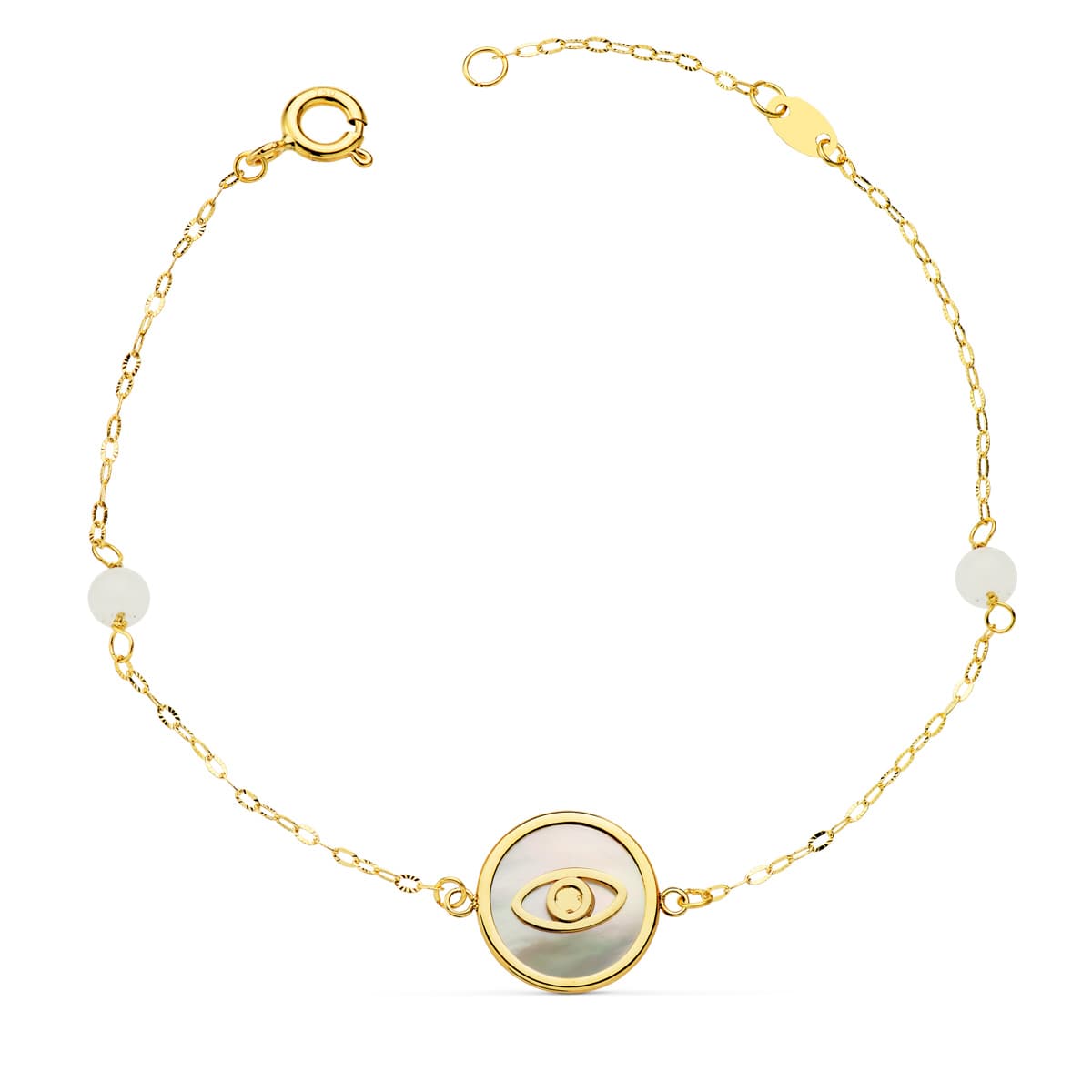 PULSERA NÁCAR CON OJO TURCO 12 MM Y BOLAS JADE 4 MM. CADENA 18 + 2,5 CM