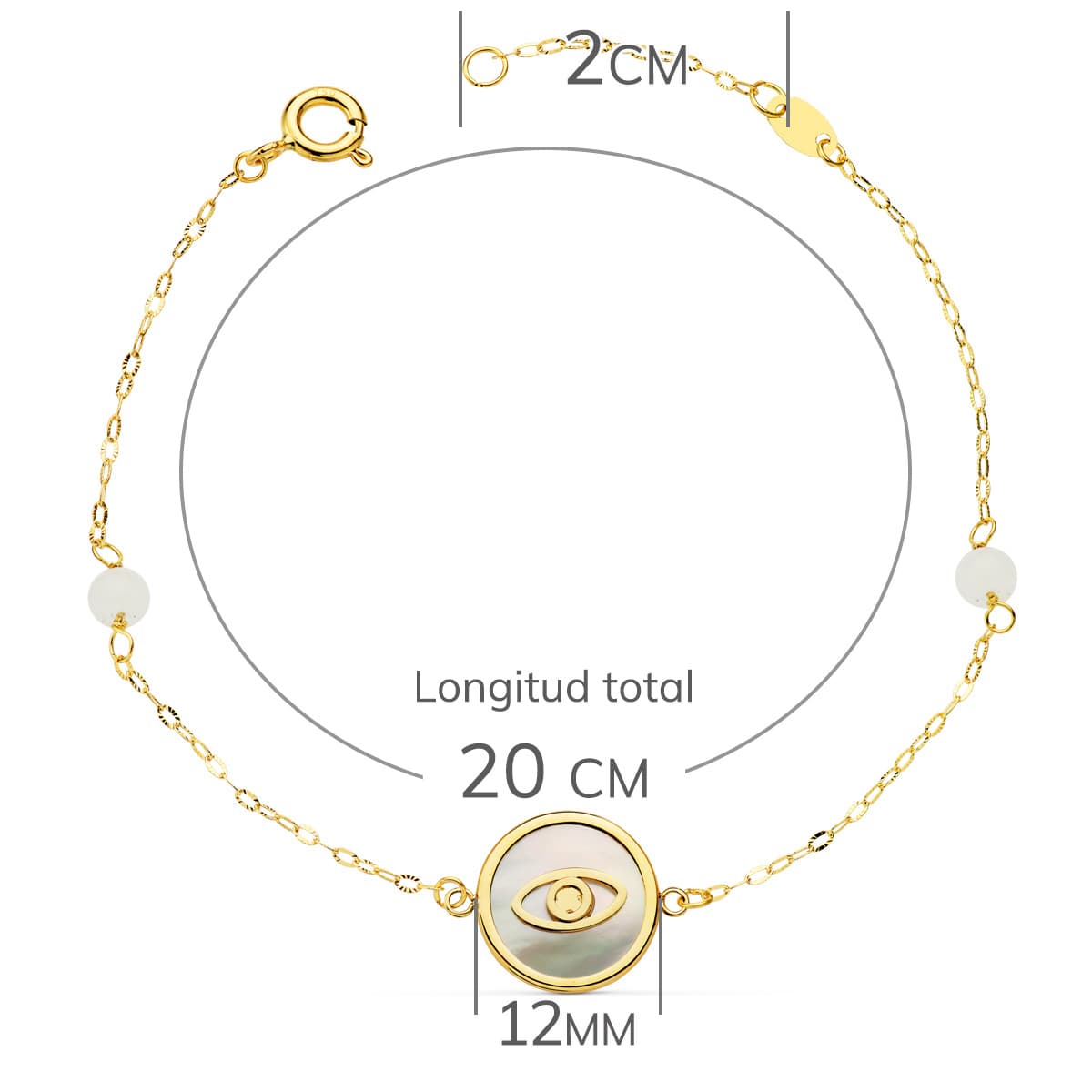 18K PULSERA NACAR CON OJO TURCO 12 MM Y BOLAS JADE 4 MM CADENA 18 + 2.5 CM