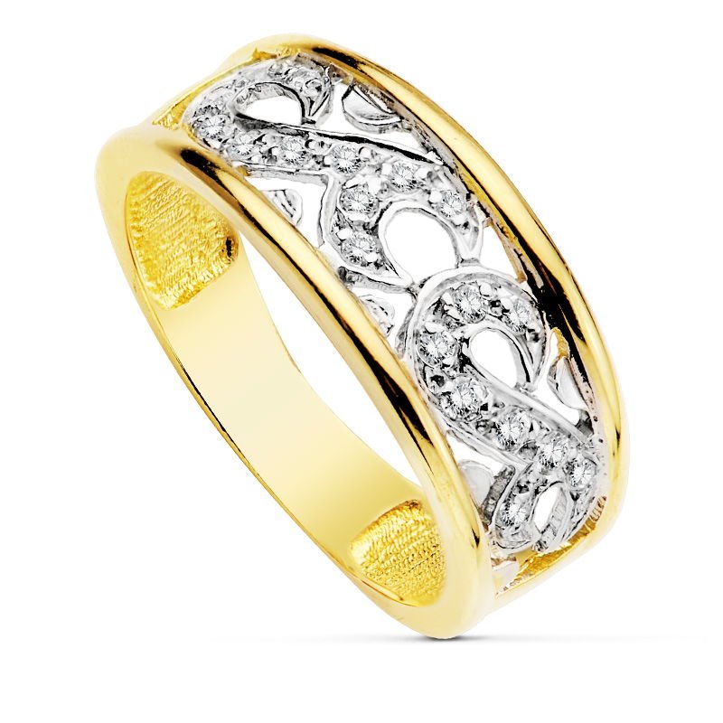 18K SORTIJA ORO BICOLOR CALADA CON CIRCONITAS. ANCHO: 5 MM