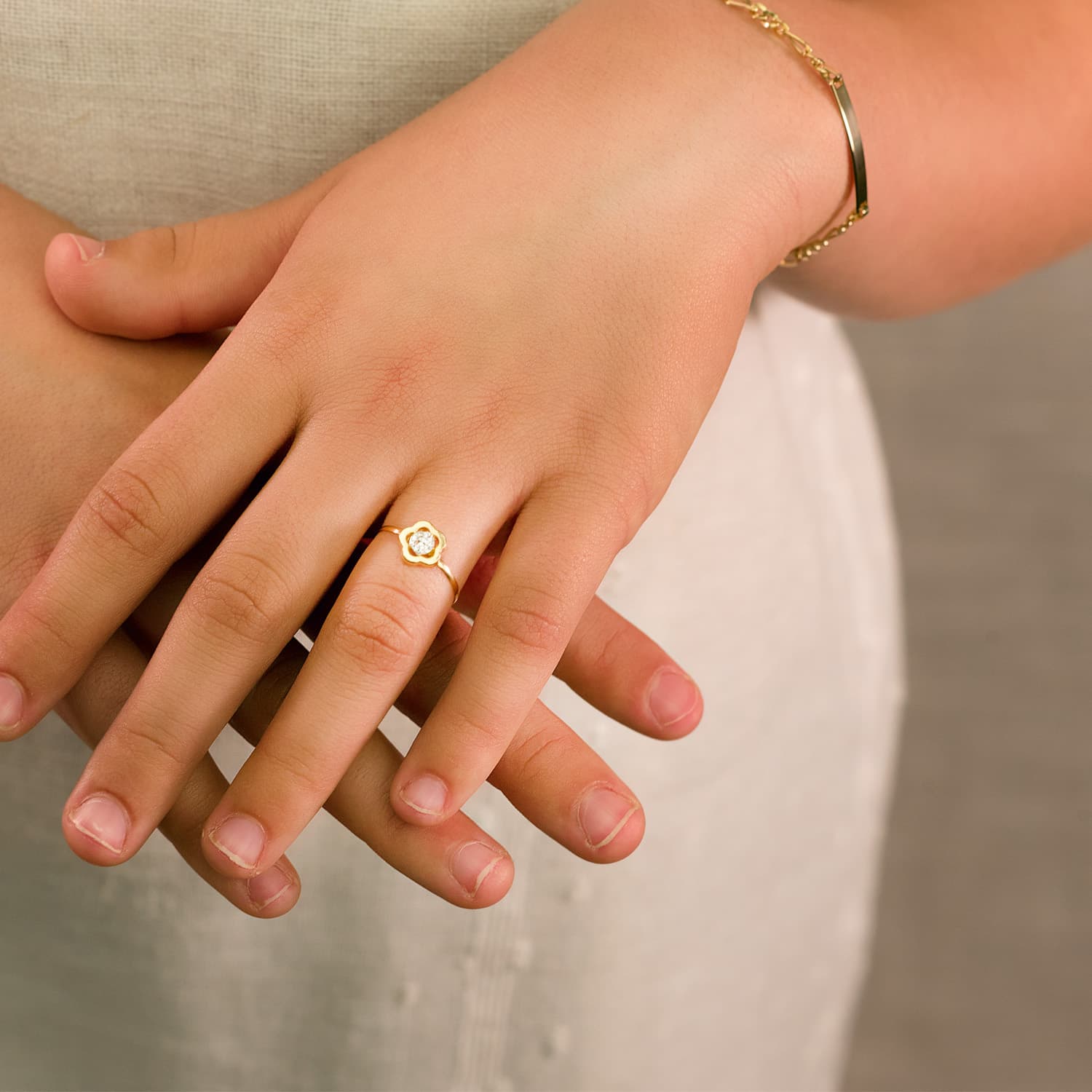 18K SORTIJA ORO AMARILLO COMUNION FLOR Y CIRCONITAS 8X8 MM. ANCHO CUERPO: 1 MM